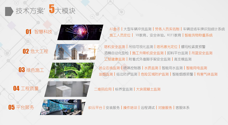 智慧工地有五大核心分區(qū):智慧科技、危大工程、綠色施工、工程質(zhì)量、平臺(tái)服務(wù)等。具體產(chǎn)品有